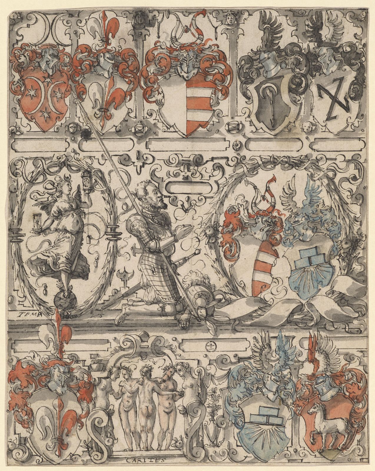 Scheibenriss mit knieendem Ritter, begleitet von Tempus, und dem Allianzwappen Gebhardt/Kriegelstein und weiteren Wappen (Riss für Hans Wernhard Gebhardt 1558-1605)