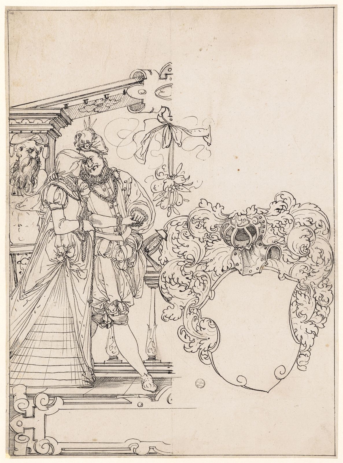 Scheibenriss mit schreitendem Liebespaar und leerem Wappenschild