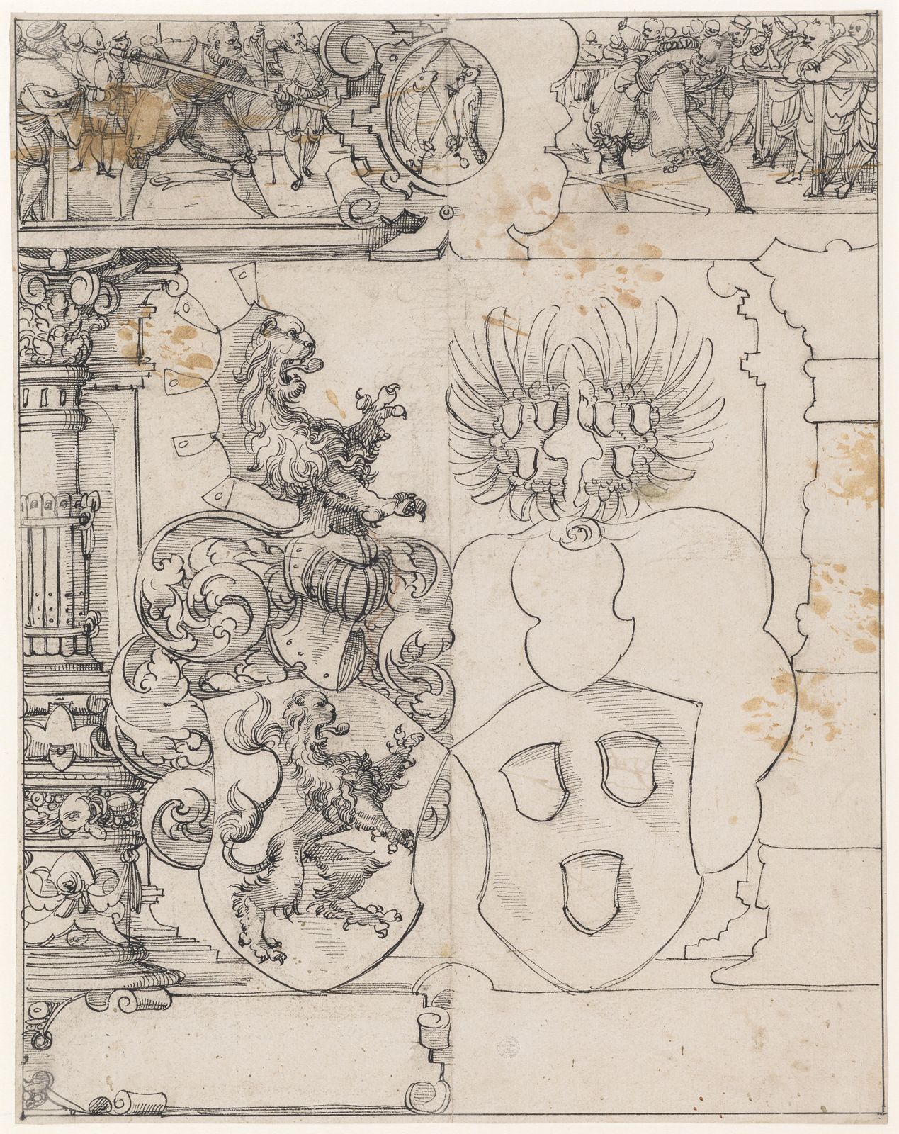 Scheibenriss mit Allianzwappen zu Rhein/von Reinach (?), im Oberbild Zweikampf mit Langspiessen und Zeichen des Ordens vom Fisch und vom Falken