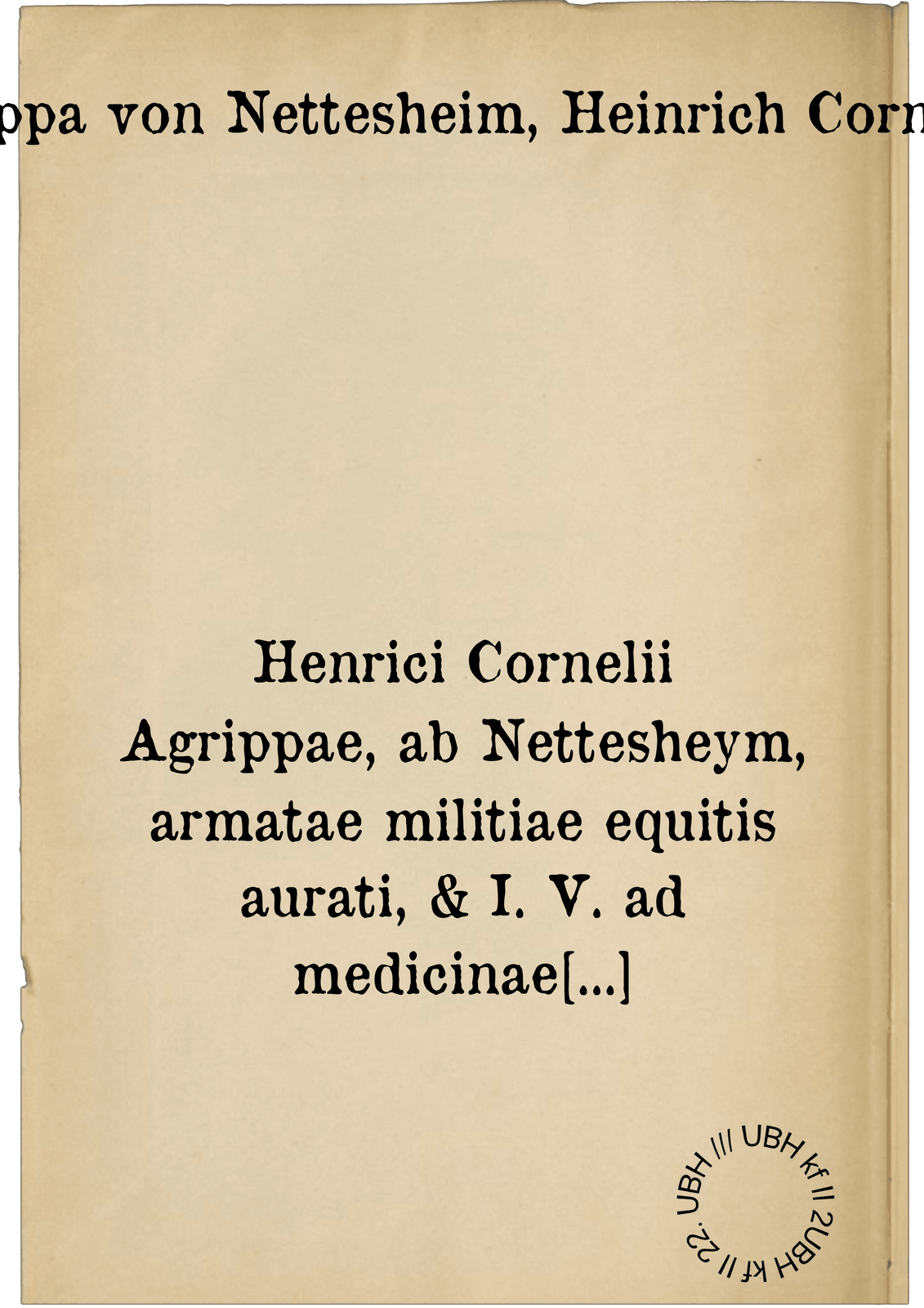 Henrici Cornelii Agrippae, ab Nettesheym, armatae militiae equitis aurati, & I. V. ad medicinae Doctoris. Opera, quaecumque hactenus vel in lucem prodierunt, vel inveniri potuerunt omnia, in duos tomos concinne digesta, & diligenti studio recognita. quae pagina post Praefationem proxima plenissime enumerantur