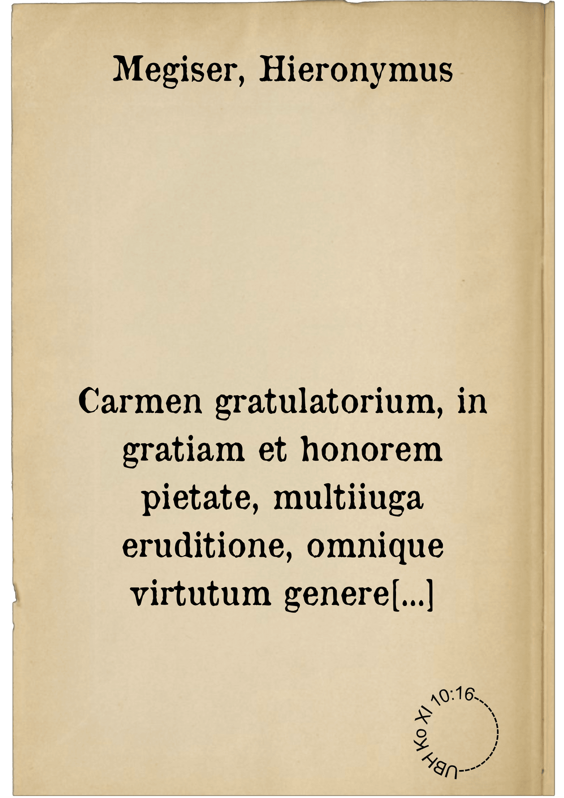 Carmen gratulatorium, in gratiam et honorem pietate, multiiuga eruditione, omnique virtutum genere praestantissimi viri d.m. Samuelis Heideni Calvensis: cùm in inclyta Academia Tubingensi publico clarissimorum virorum applausu, supremos v.i. titulos consequeretur