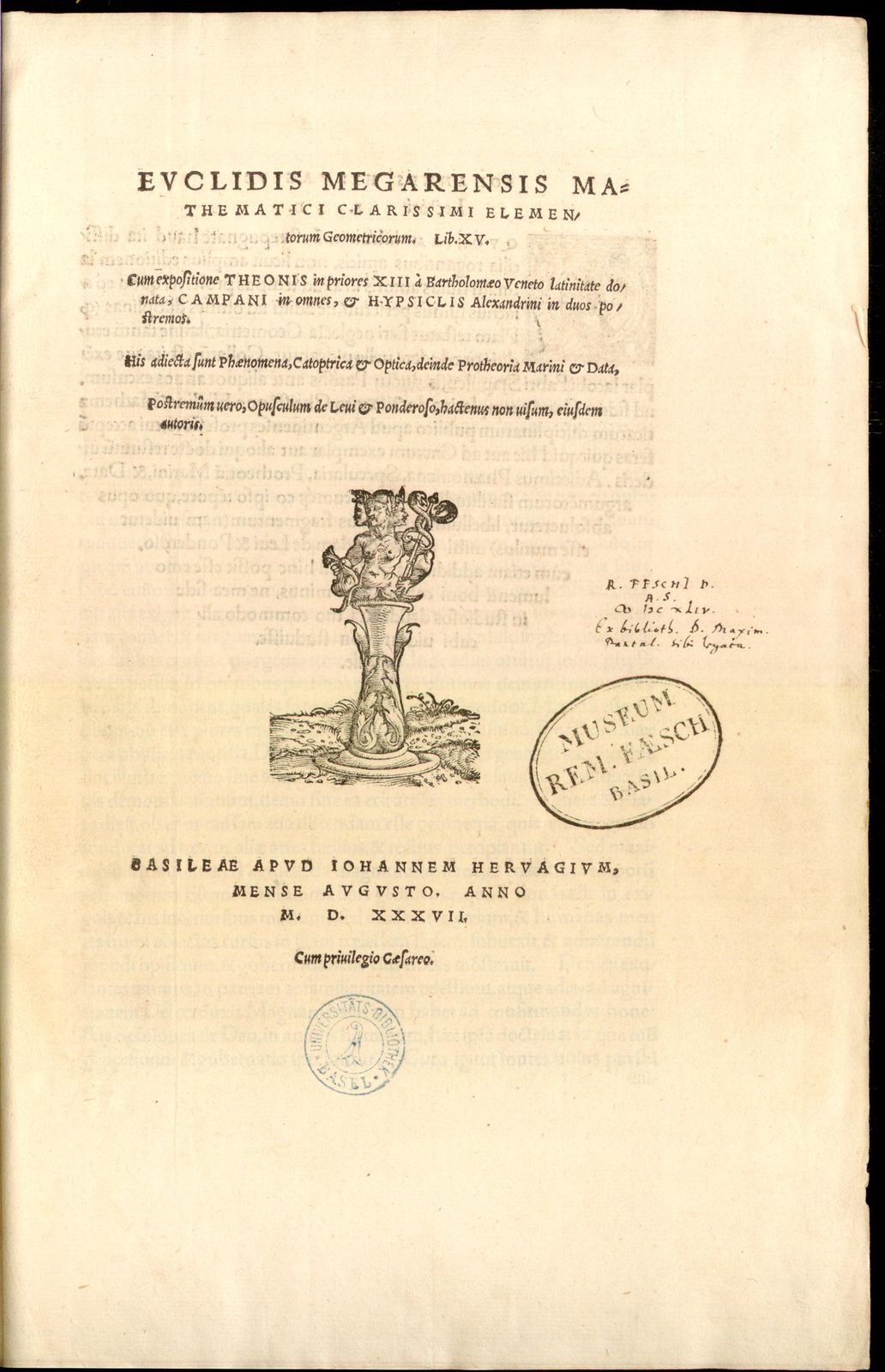 Euclidis Megarensis mathematici clarissimi Elementorum Geometricorum Lib. XV. ; Cum expositione Theonis in priores XIII a Bartholomaeo Veneto latinitate donata, Campani in omnes, & Hypsiclis Alexandrini in duos postremos ; His adiecta sunt Phaenomena, Catoptrica & Optica, deinde Protheoria Marini & Data ; Postremum vero, Opusculum de Levi & Ponderoso, hactenus non visum, eiusdem autoris